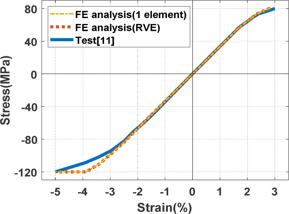 해석에 사용할 3차원 RVE 전체를 기지요소로 변환한 모델의 단순 인장 및 압축해석의 응력-변형률 곡선을 시험결과와 비교하여 Fig. 3과 같이 나타냈다. 해석 및 시험결과가 본 연구에서 다루고자 하는 인장 및 압축 방향에서 잘