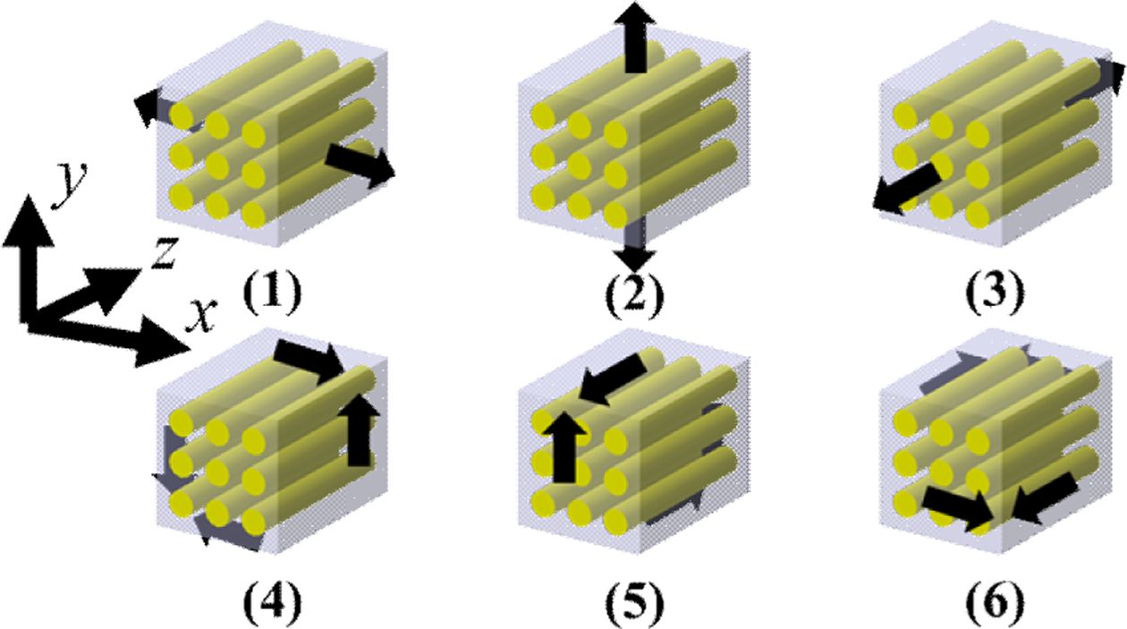 비균질 재료를 균질 재료로 가정하여 등가강성을 도출하는 기법이다. 3차원 RVE에 대해 Fig. 4와 같은 6가지 경계조건을 적용한 구조해석을 수행해 해석결과의 응력으로 식 (2)와 같이 체적평균화를 시킨 뒤 식 (3~4) 과정을 거쳐 유연도 행렬을 구하여 등가강성을 도출한다. RVE에 경계조건을 적용할 때 주기적인