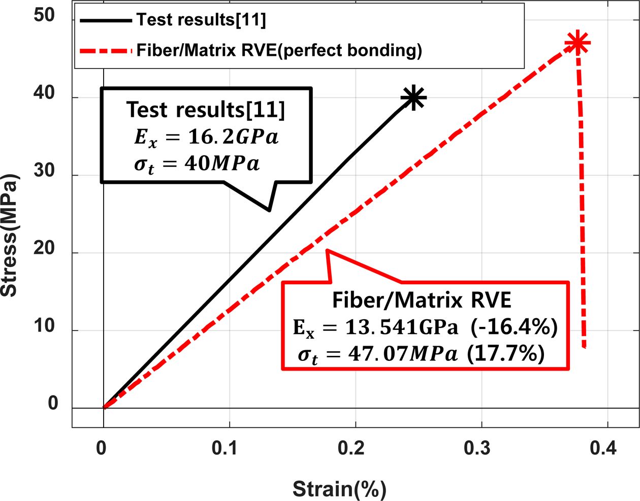 보정결과로부터 복합재료 RVE의 등가강도는 적절히 보정되었으나 등가강성이 여전히 시험결과보다 작게 나오며 이로 인해 파단변형률에 큰