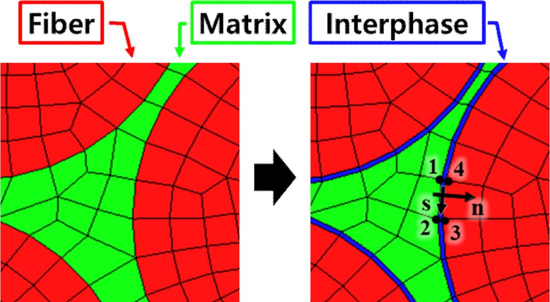 본 연구에서는 섬유, 기지 및 계면으로 구성된 복합재료 RVE 계면의 물성 및 두께를 변화시키며 복합재료의 등가강성과 등가강도를 예측