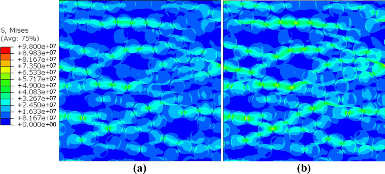 Fig. 7 Von-Mises stress (Pa) contours of (a) the RVE and (b) the RVE with interphase layer(2-2 case) at 0.1% strain |