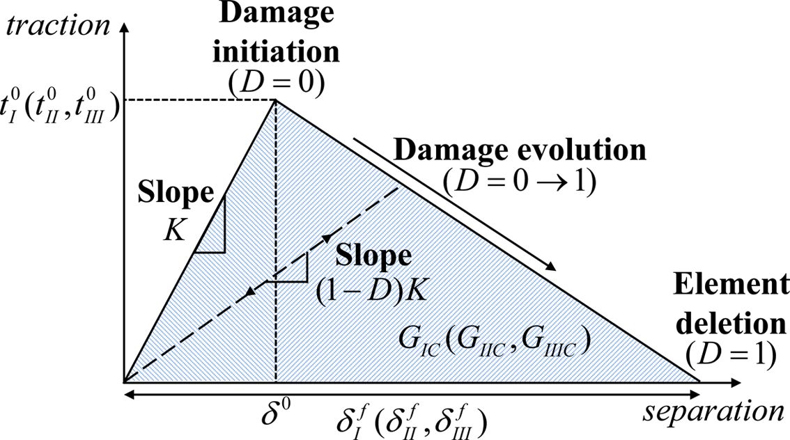 가로방향 강도에 영향을 미치게 된다. 이러한 현상을 표현하기 위해 Fig. 8과 같이 traction-separation law를 따르는 응집영역요소(cohesive