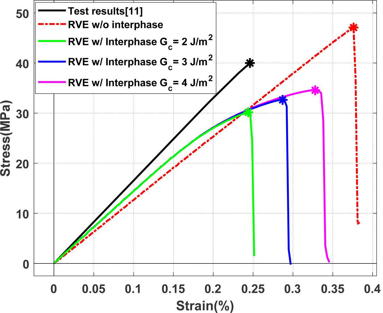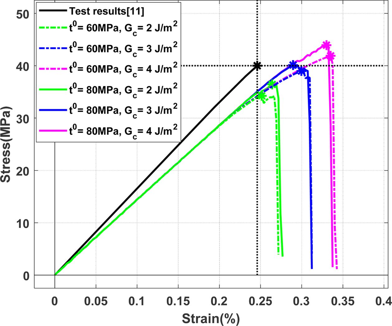 Fig. 10 Effect of the interphase strength and fracture energy on the stress-strain curve of E-Glass/MY750 RVE |