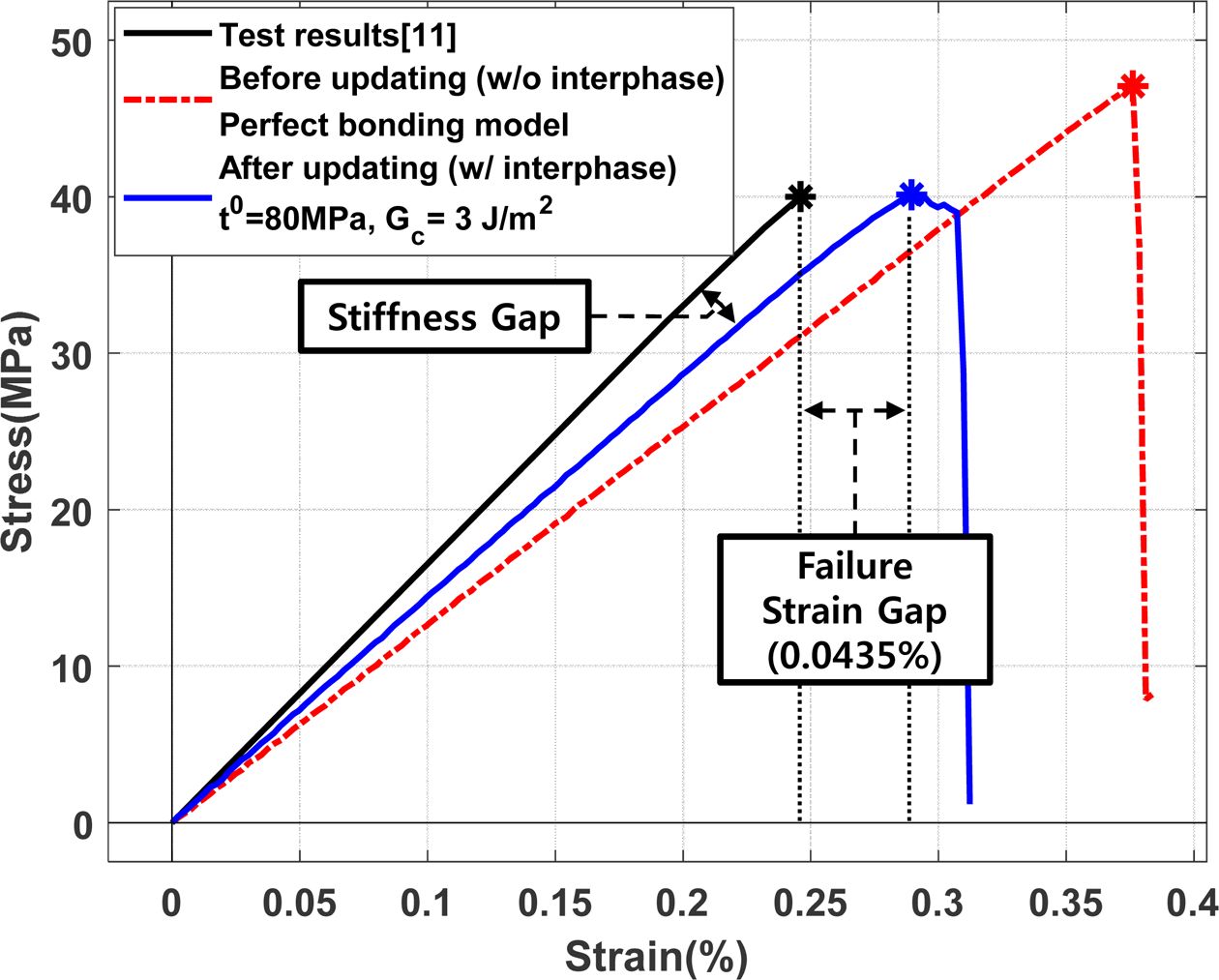 물성 Exinterphas와 Gzxinterphase가 커질수록 시험결과에 근접함을 확인할 수 있다. 하지만 Table 3의 case 3처럼 계면의 강성 Exinterphas를 1000 GPa만큼 극단적으로 높여도