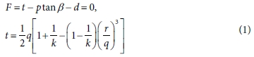 stress), β는 p - t 평면에서의 선형 포락선의 기울기, d는 응집력(cohesion), q는 Von-Mises 응력, k는 삼축 압축 항복응력에 대한 삼축 인장 항복응력의 비율, r은 편차응력의 3차 불변량이다. k = 1이라 가정한 식 (1)에 일축 인장 및 압축 항복응력을 대입하여 Table 2와 같이 β와 d를 유도하였다. 그리고