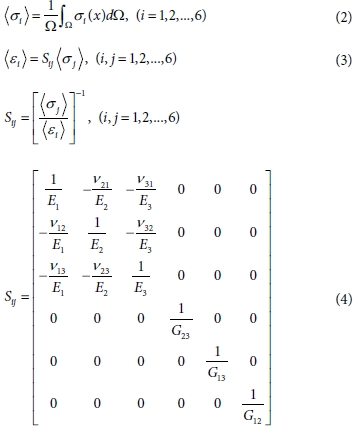 식 (2~4)의 si, ei, W, Sij는 각각 i 방향 응력과 변형률, RVE의 전체 체적, 유연도 행렬을 의미한다.