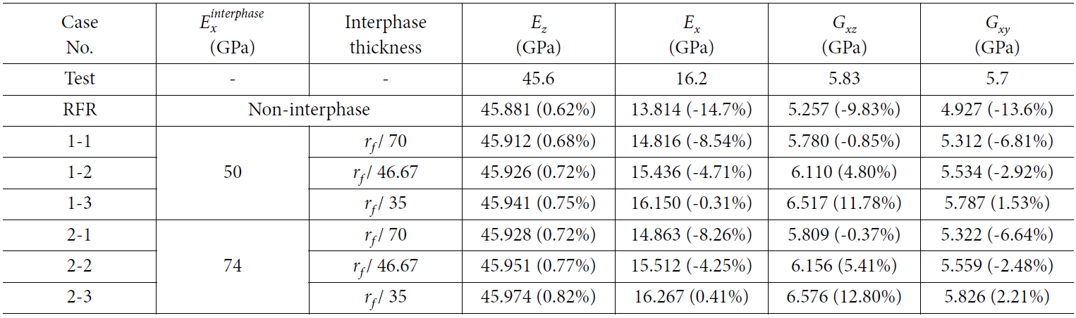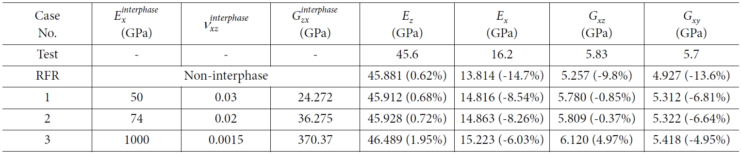 2.3절과 동일한 방법을 통해 예측된 계면의 물성 변화에 따른 복합재료 RVE의 등가강성은 Table 3과 같다. 독립변수로 설정한 계면의 가로방향 물성 , Exinterphas ,νxzinterphase 및 Gzxinterphase를 3가지 경우로 나누어 해석하였다. 계면을 고려한 해석모델의 등가강성은 계면의 가로방향