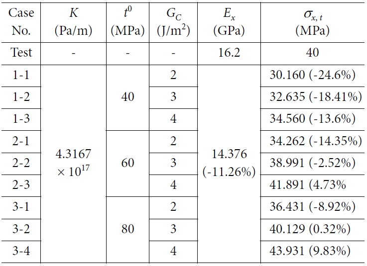 등가강성은 모두 14.376 GPa로 동일하였다. 계면의 물성이 최대응집응력 80 MPa, 파괴인성 3 J/m2일 때 시험결과와 매우 비슷한 40.129 MPa(오차