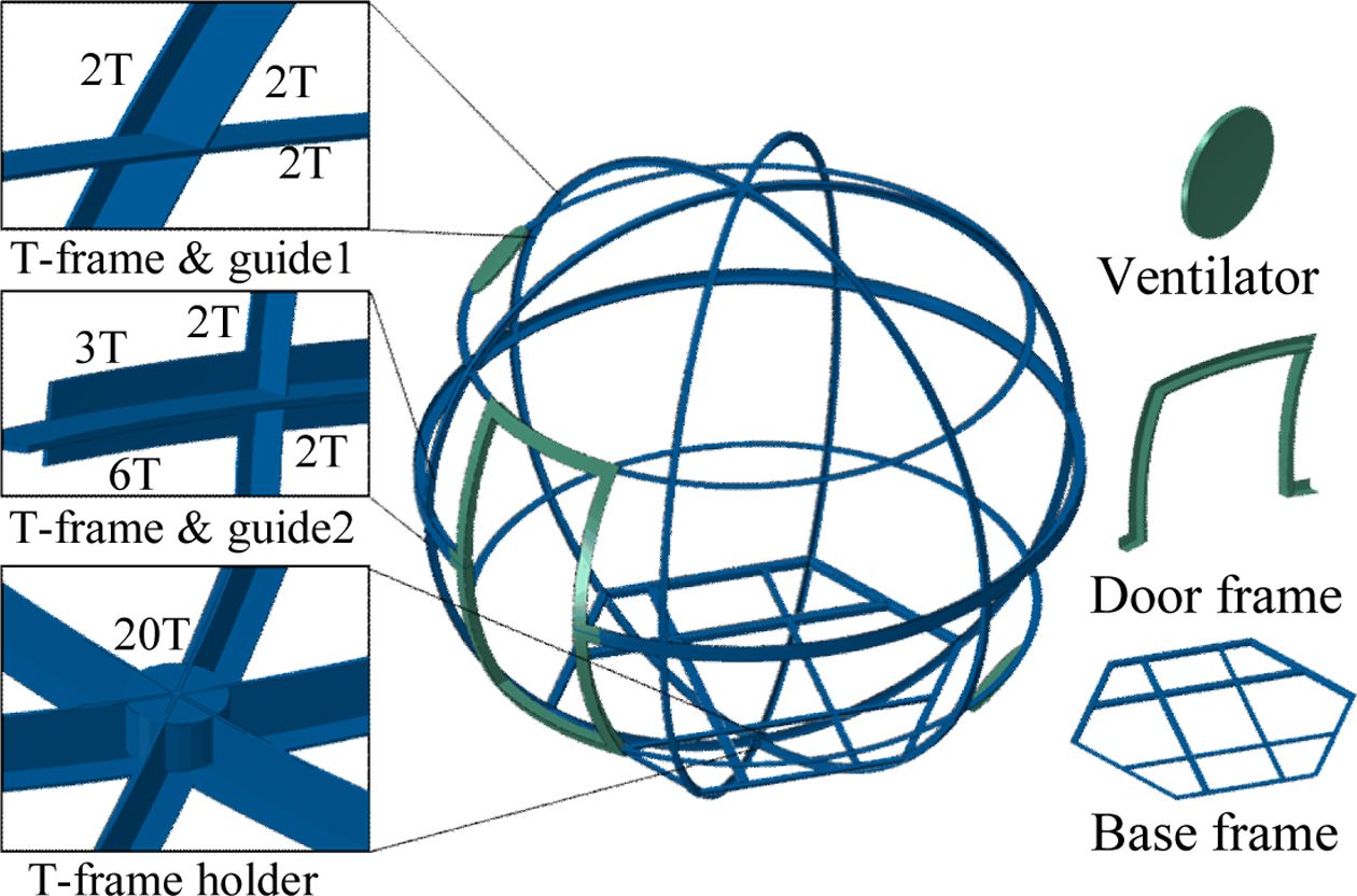 복합재 내부에 T형 스테인리스 스틸 프레임을 삽입하여 굽힘 강성을 추가로 보강하고 구체의 처짐을 방지하였다. T형 프레임의 구성은 Fig. 3과 같다. 그 외 구성 요소는 장비 및 탑승자를 받쳐주는 스테인리스 스틸로 설계된