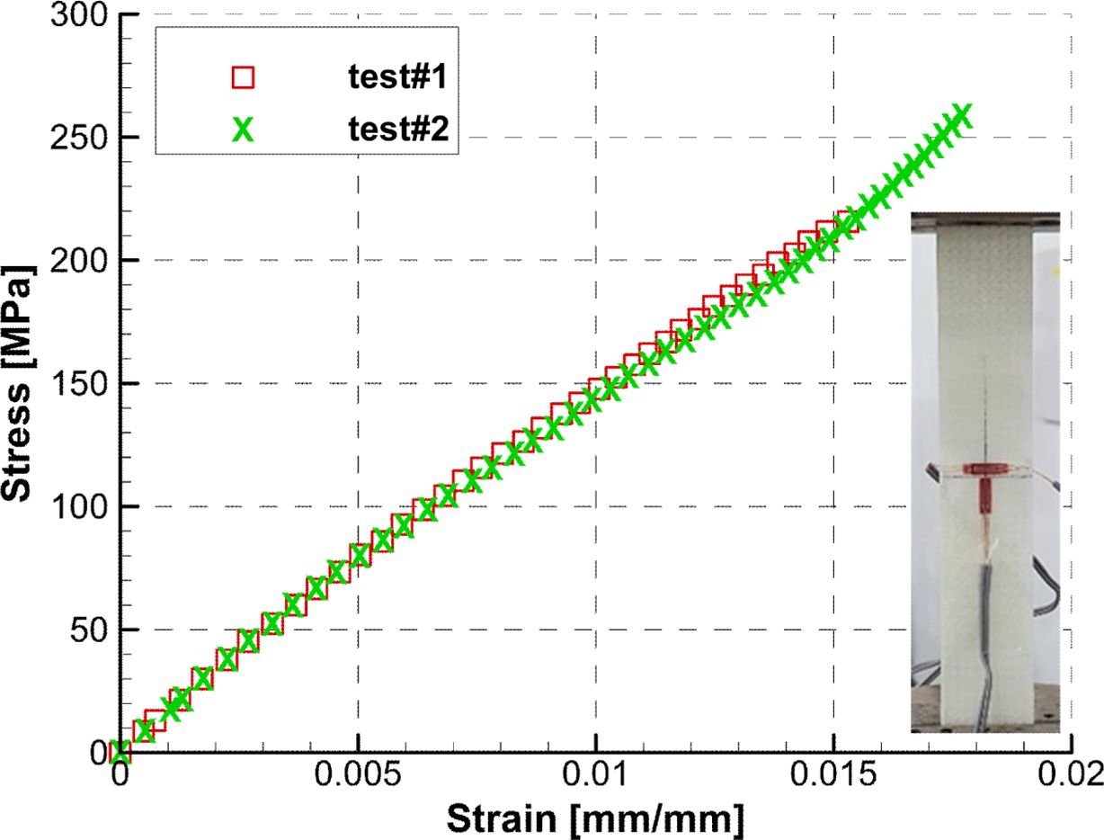 유리섬유/에폭시에 대한 응력-변형률 곡선을 보여준다. 준 등방성의 DBLT 특성상 1방향과 2방향의 물성은 같다고 가정하였으며, 인장 강도와 압축