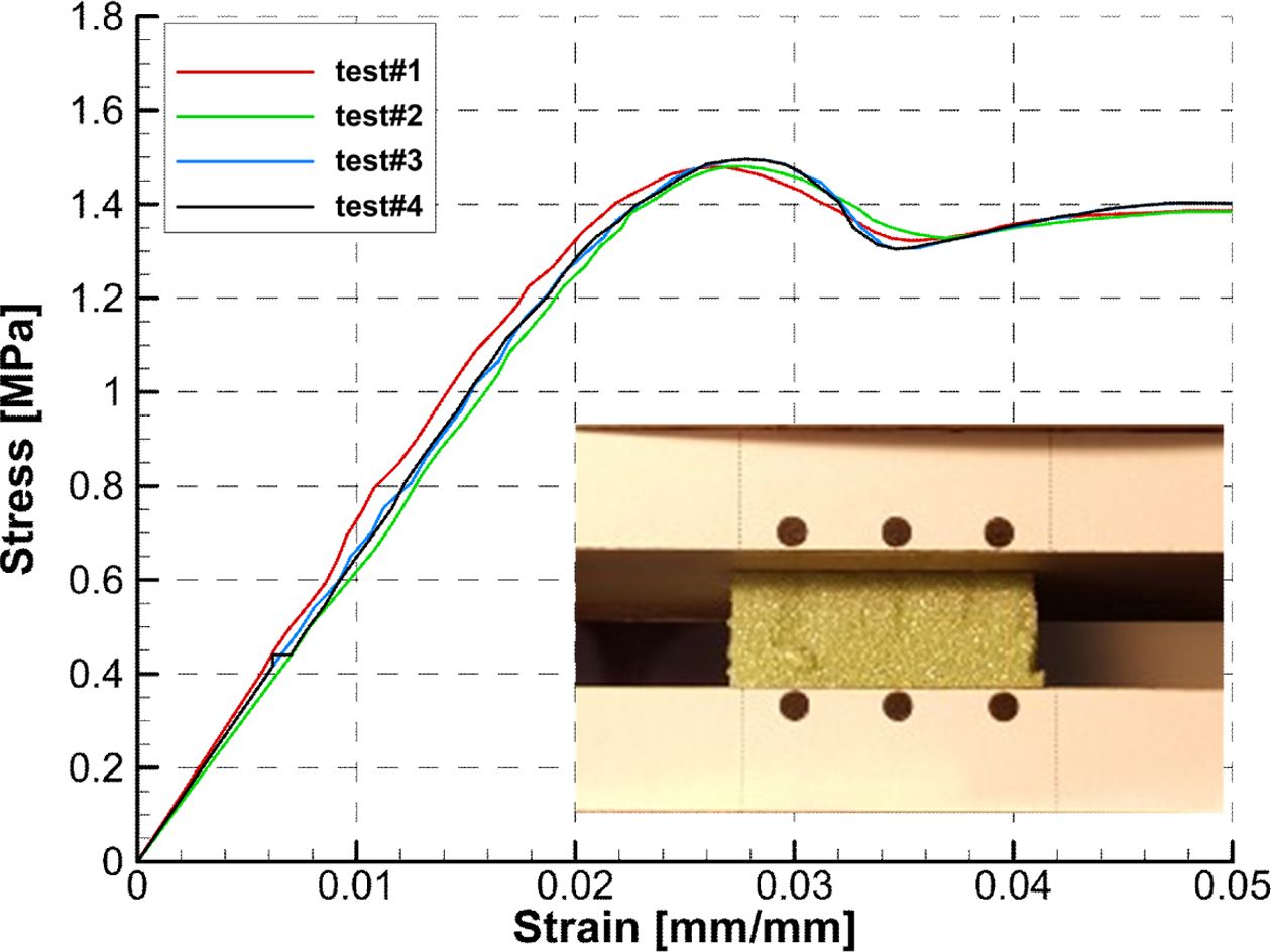 폼 심재의 응력-변형률 곡선을 보여준다. ASTM C365[5]에 근거하여 1 mm/min 시험 속도로 진행되었으며 위아래 각각 세 개 점의 이동을 추적하는