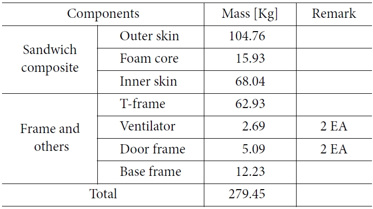 유한요소모델을 통한 각 파트들의 무게 추정치는 Table 1과 같다. 모델은 1,379,531개의 C3D10 요소(Ten-node tetrahedral element)와