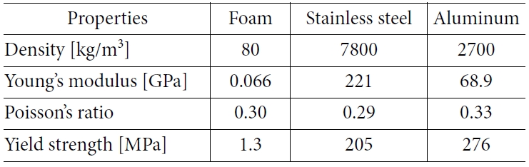DIC 기법을 통해 변형률이 계산되었다. Table 3은 시험을 통해 얻은 폼 심재와 스테인리스 스틸, 그리고 알루미늄의 물성을 보여준다.