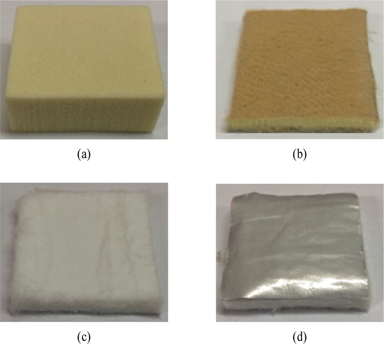 Fig. 2 Photograph of (a) PUF, (b) Kevlar composite mat, (c) Arogel composite mat, and (d) Cryogel composite mat |