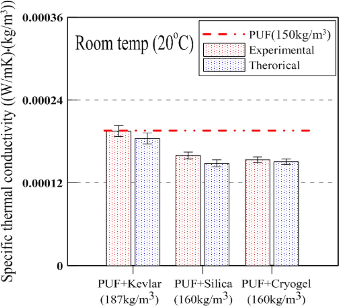 PUF에 대해 케블라, 에어로겔, 그리고 크라이오겔 복합 매트를 보강하였다. 열적 성능의 변화를 확인하기 위해서 상온에서의 열전도율을 측정하였으며,