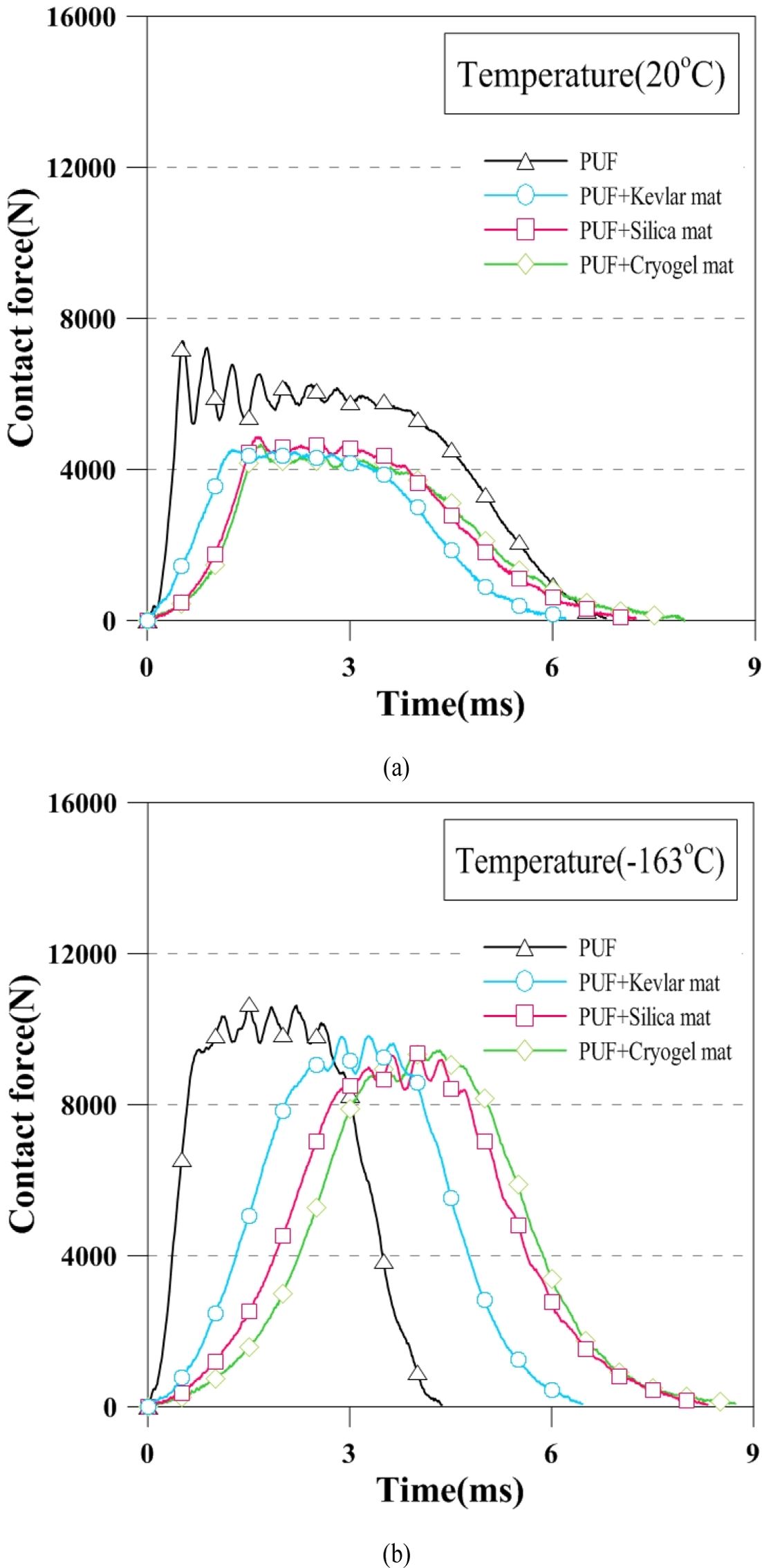 PUF와 복합 단열 매트가 보강된 PUF의 내충격성을 평가하기 위하여 온도를 변수로 접촉력 및 접촉 시간, 흡수에너지를 분석하였으며,