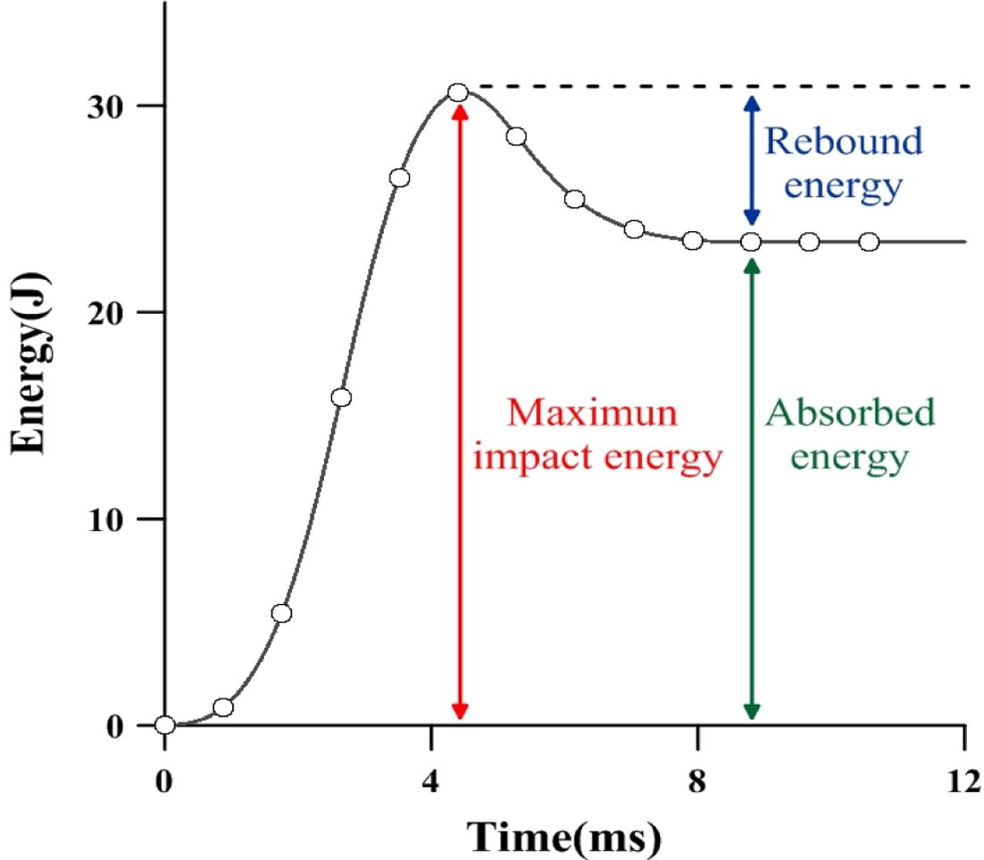 가해지는 충격에너지로 정의된다. 최대 충격에너지 이후 평탄 부분의 에너지는 흡수에너지로 정의되며, 충격에너지와 흡수에너지의 차이는 임팩터에 반등는 리바운드 에너지로 정의된다[13].