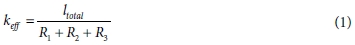 여기서, keff 는 열전도율 이론 값, ltotal는 시편 전체 길이, R1는 PUF의 열 저항 값, R2는 복합 단열 매트의 열 저항 값, R3는 접착층의 열 저항 값을 의미한다. PUF 및 복합 단열 매트의