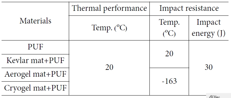 보강되지 않은 PUF와 비교하였으며, 내충격성은 접촉력, 접촉 시간, 그리고 흡수에너지를 평가하였다. 실험 결과 크라이오겔 복합 매트 보강 시 가장 우수한 열적 성능을 나타났으며,