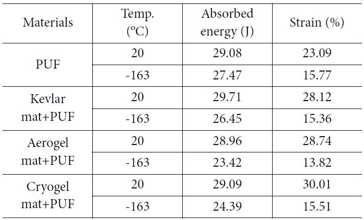 Fig. 6를 바탕으로 Table 4의 상온과 극저온에서 PUF 및 복합 단열 매트가 보강된 PUF의 충격에너지에 대한 흡수에너지
