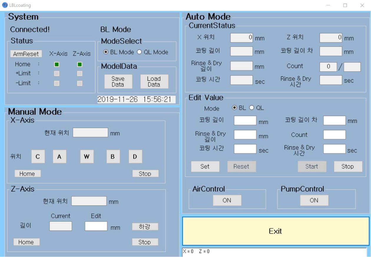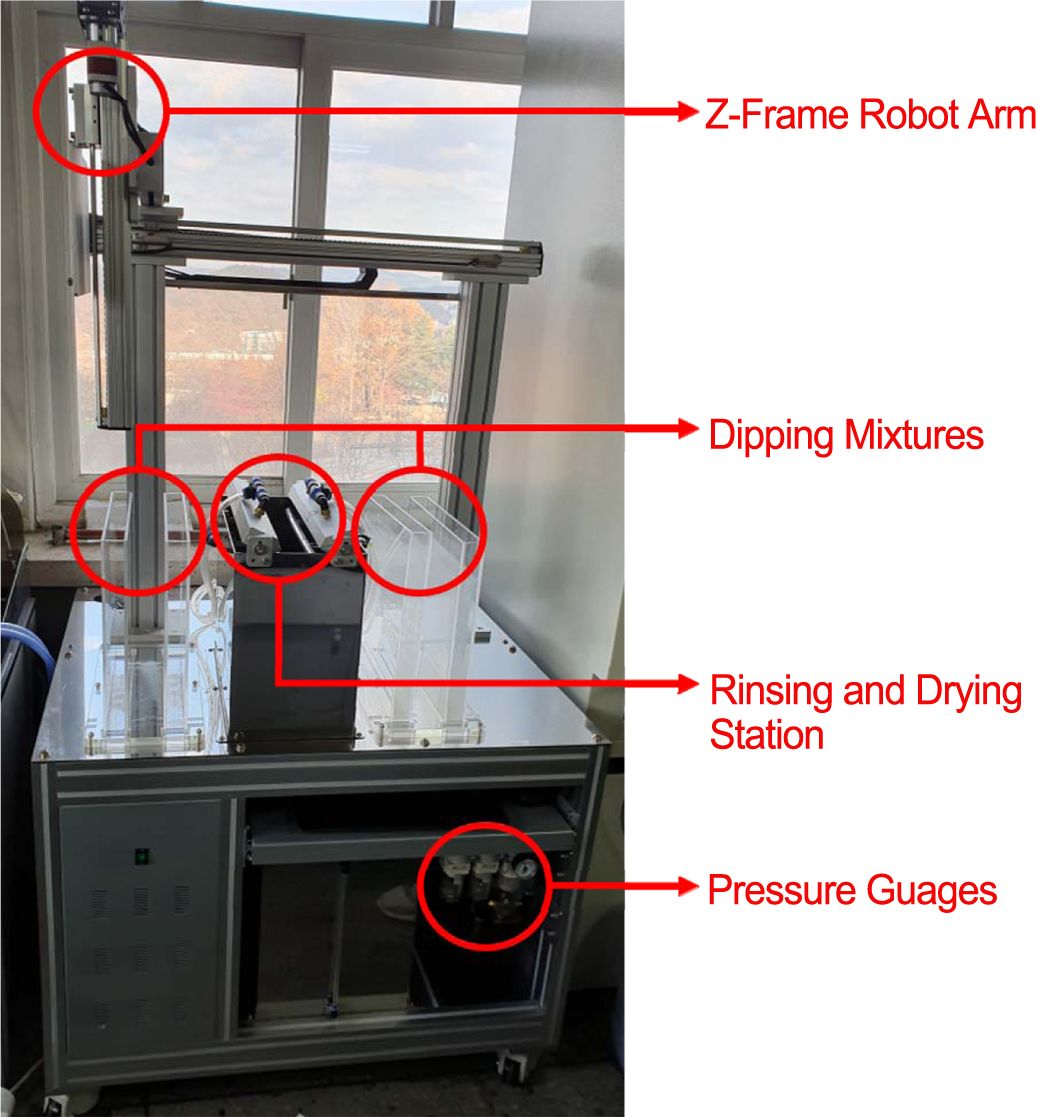 프로그램으로 만들었으며, 컴퓨터 컨트롤러를 통해 담금 시간, 적층 횟수, 로봇 암의 위치, DI water와 압축 공기의 분사 시간, 적층 시퀀스(예를
