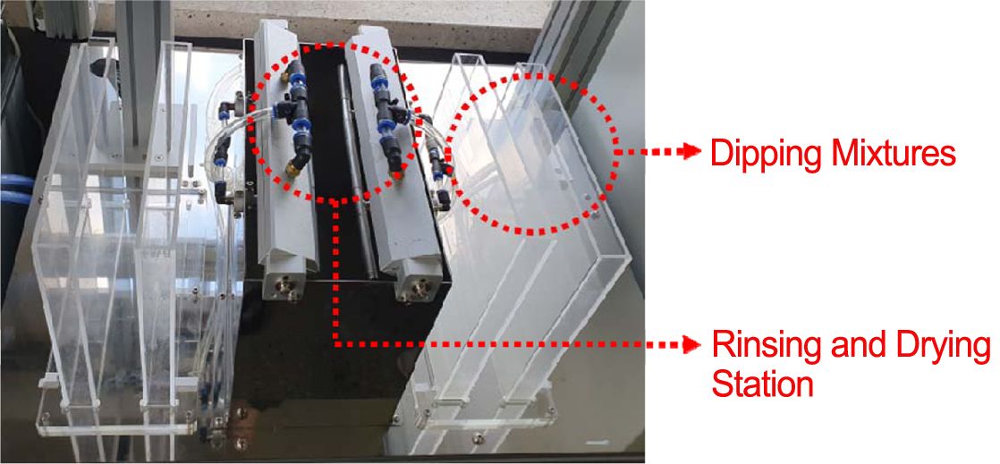 dipping 시스템을 제안하고 제작하였다. 이들 필름은 다층박막적층 기술을 사용하여 기판 상에 적층된다. 로봇암을 갖는 자동화 시스템은 기판을