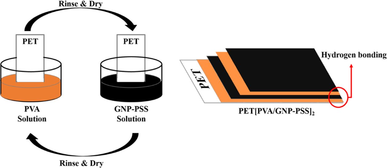 위에 PVA와 GNP-PSS가 수소 결합에 의해 하나의 균일한 층을 형성한다. 본 연구에서는 이와 같이 GNP-PSS 용액과 그 상대편 재료의