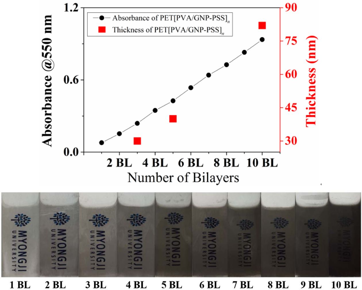 Fig. 6 Absorbance data of PET[PVA/GNP-PSS]n (n = 1~10 BL) samples (black line), thickness data of PET[PVA/GNPPSS]n (n = 3, 5, 10 BL) samples (red square), and sample images of PET[PVA/GNP-PSS]n (n = 1~10 BL) |