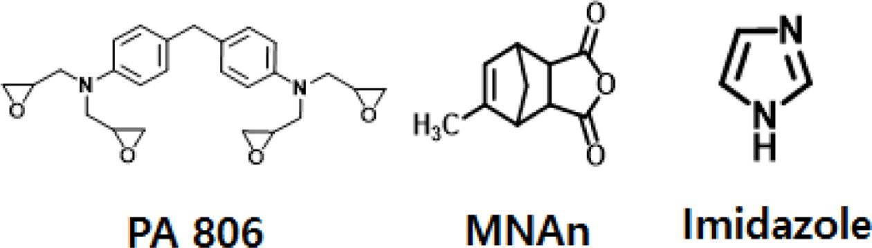 4관능성 에폭시(PA 806)과 산무수물계 경화제(MNAn)을 사용하고 경화촉진제(Imidazole)의 함량을 3과 5 phr로 달리하면서