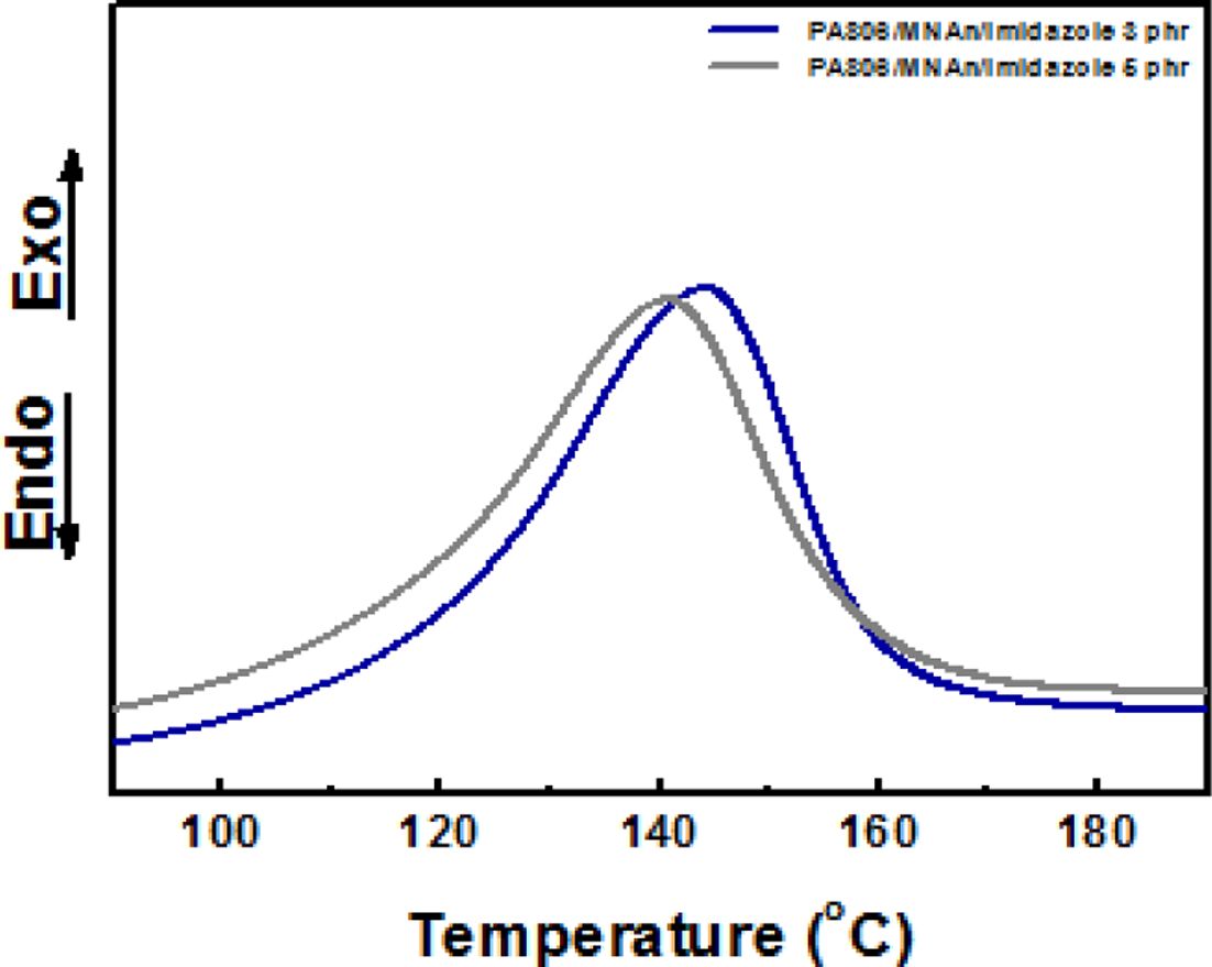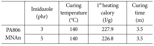 PA 806과 MNAn, Imidazole 3, 5 phr의 경화 결과 경화온도는 DSC 1st heating을 통해 약 140oC 부근임을 확인하였고