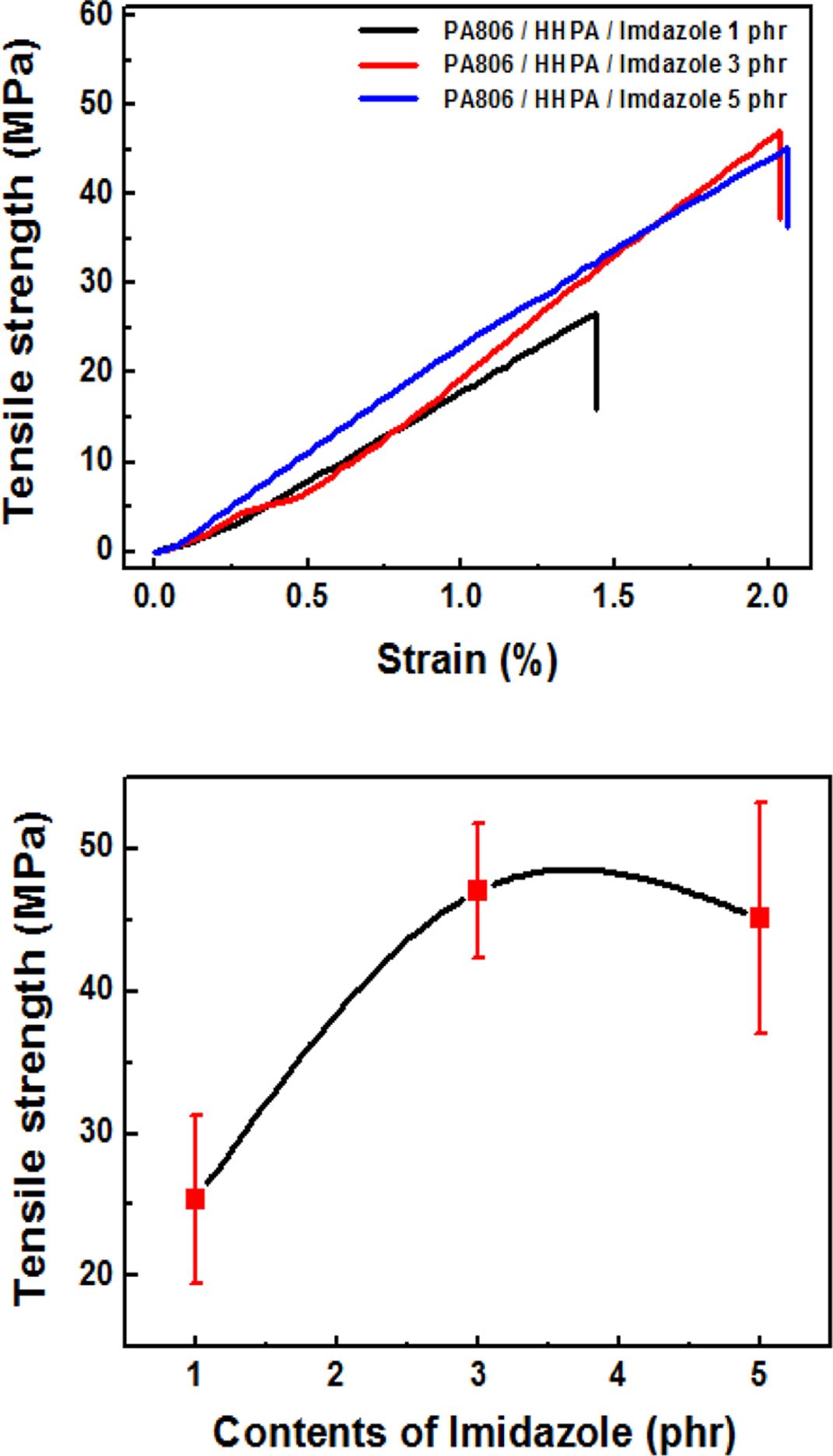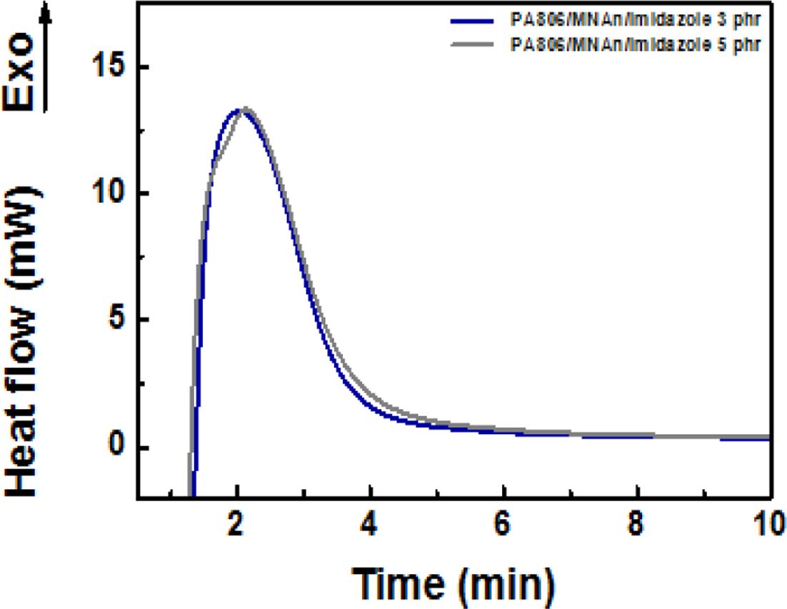 MNAn에 경화촉진제(Imidazole)의 함량을 3 phr, 5 phr 두가지 경우로 달리하여 시험을 진행하고, 4관능성 에폭시(PA