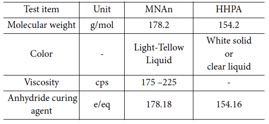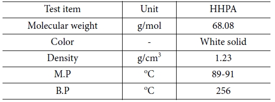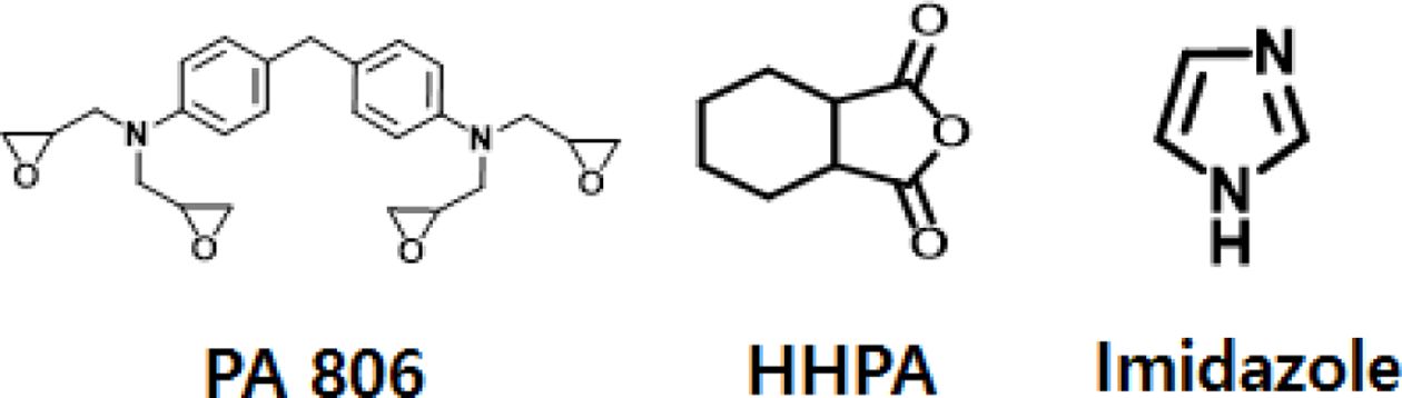 점도로 인해 많은 양의 에폭시와 mixing이 가능하며 높은 필러함량의 에폭시 어플리케이션에 적합하다[13]. 본 연구에서 사용된 HHPA는 국도화학의 제품을 사용하였다(Table 1).