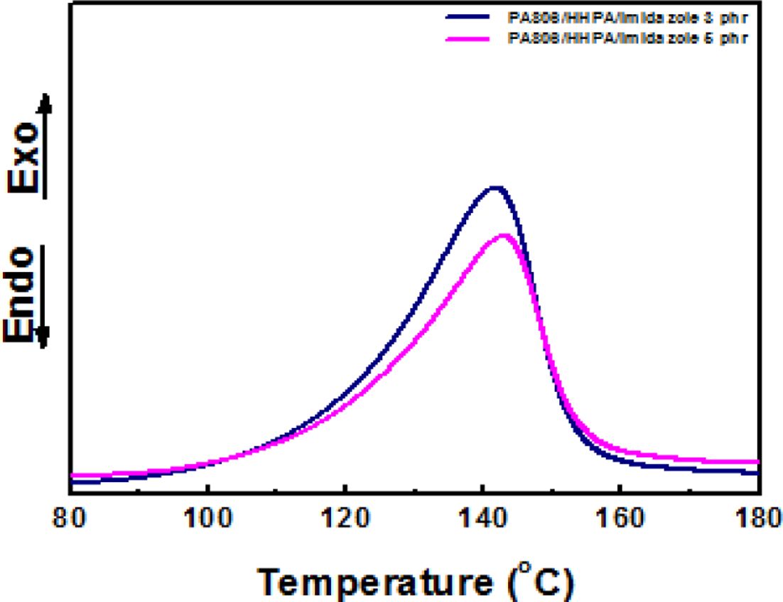 PA 806과 HHPA, Imidazole 3, 5 phr의 경화 결과 경화온도는 DSC 1st heating을 통해 약 140oC 부근임을 확인하였고