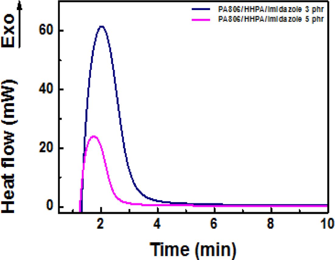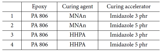 4관능성 에폭시(PA 806)과 산무수물계 경화제(HHPA)를 사용하고 경화촉진제(Imidazole)의 함량을 3과 5 phr로 달리하면서