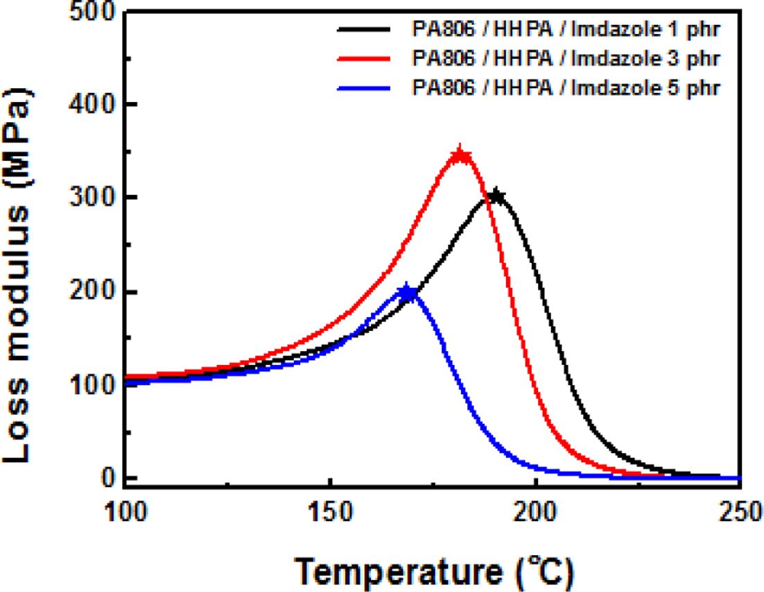 산무수물계 경화제를 사용하여 최적의 경화촉진제 양을 파악하기 위해 경화촉진제를 함량별로 에폭시를 경화 한 후 경화물 분석을 실시하였다. DMA를