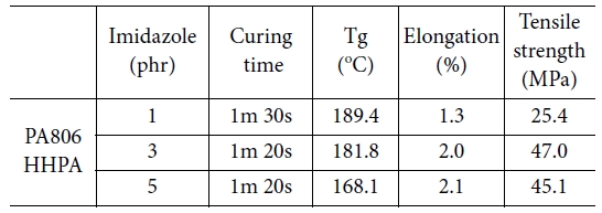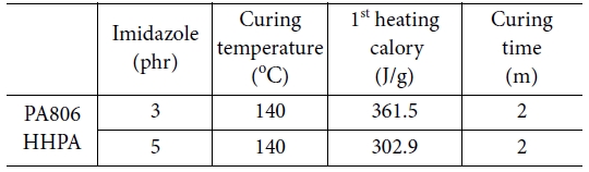 806)과 HHPA의 경우도 3 phr, 5 phr의 경화촉진제 함량으로 시험을 진행하여 최적의조건을 도출하였다(Table 3).