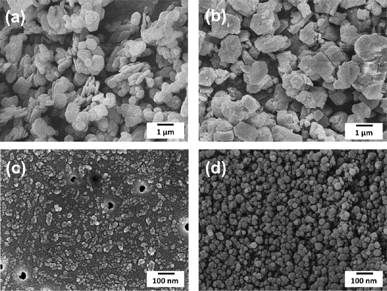 Fig. 1 SEM images of (a) Mg(OH)2, (b) Al(OH)3, (c) AlOOH, and (d) Al2O3 |