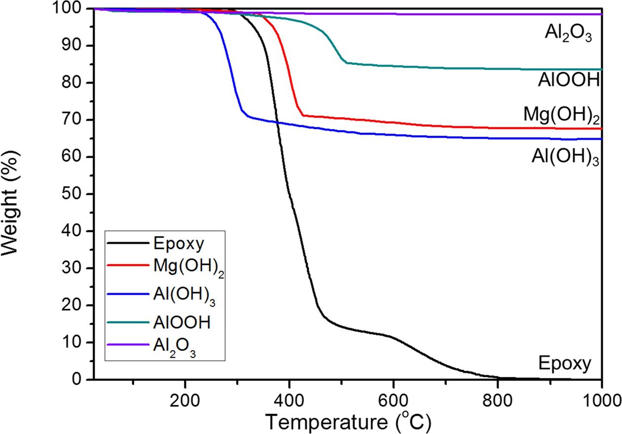 Fig. 2 TGA curves for epoxy resin and inorganic fillers (Mg(OH)2, Al(OH)3, AlOOH, and Al2O3) |