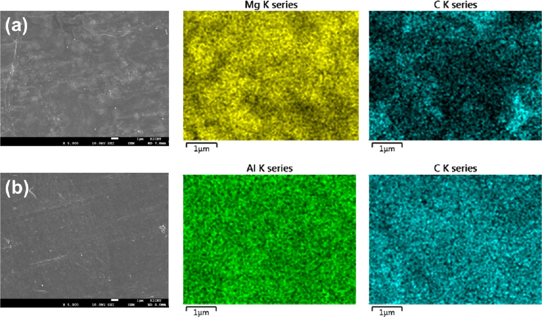 표면의 SEM 이미지와 mapping 결과를 Fig. 3에 나타내었다. Fig. 3 mapping 이미지는 검출된 각 필러의 주요 원소(수산화마그네슘-Mg, 수산화알루미늄-Al)가