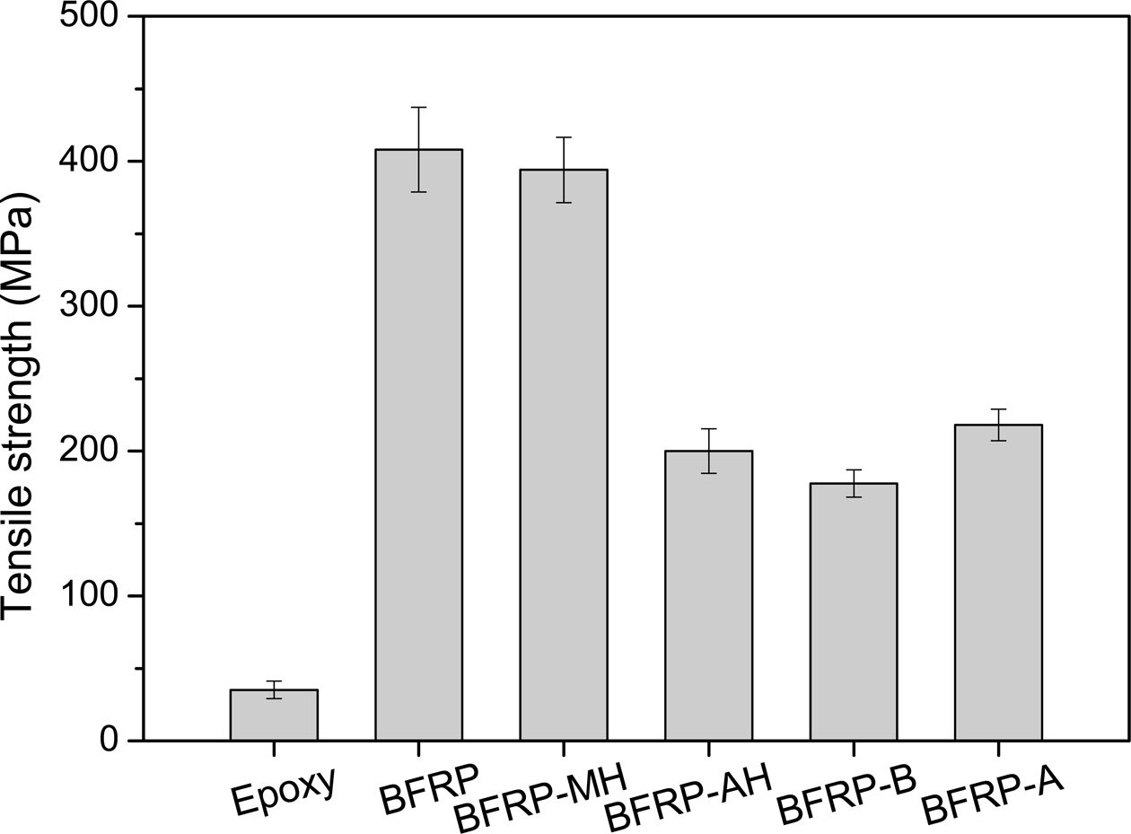 확인하였다. 난연제가 첨가된 복합재료의 경우 BFRP-MH는 BFRP와 유사한 인장강도를 보이나, BFRP-AH, BFRP-B, BFRP-A는