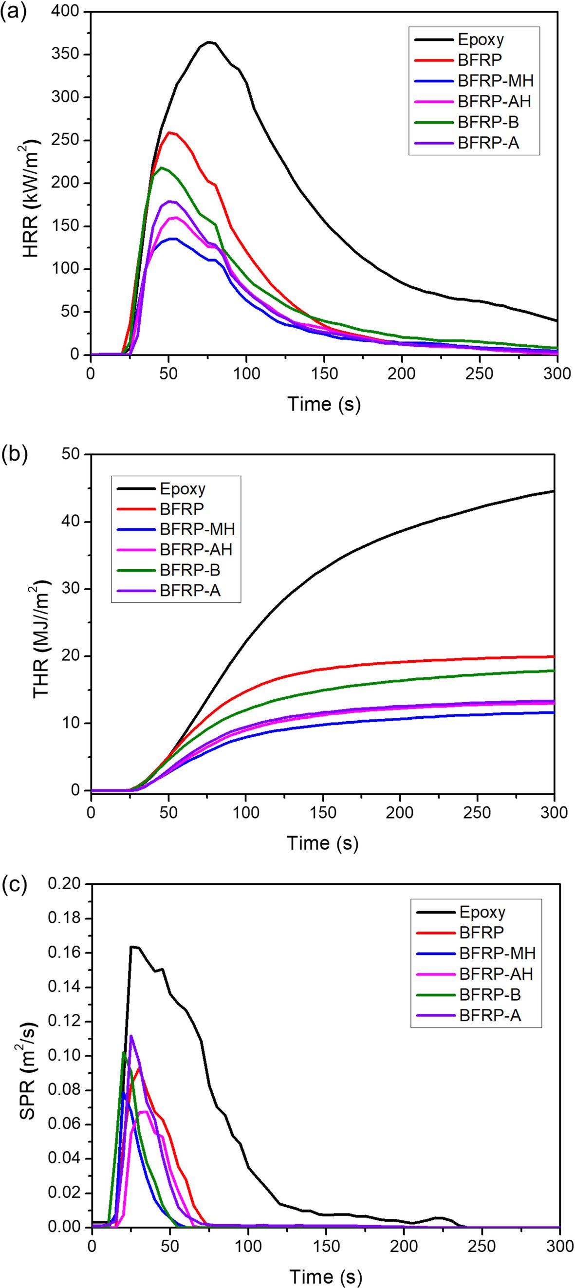 BFRP-F showed the lower peak heat release rate (PHRR), total heat release (THR)