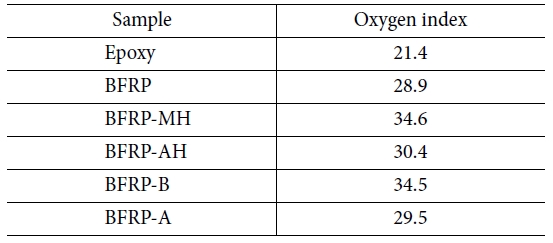 Fig. 6와 Table 2에 난연제를 종류별로 첨가한 복합재료의 LOI 측정 결과를 나타내었다. LOI 측정 결과 섬유