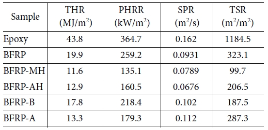 나타내었다. 섬유 및 난연제 첨가에 따라 THR 또한 감소하는 것을 확인하였으며 BFRP-A, BFRP-AH, BFRP-MH 순으로 낮아진다.