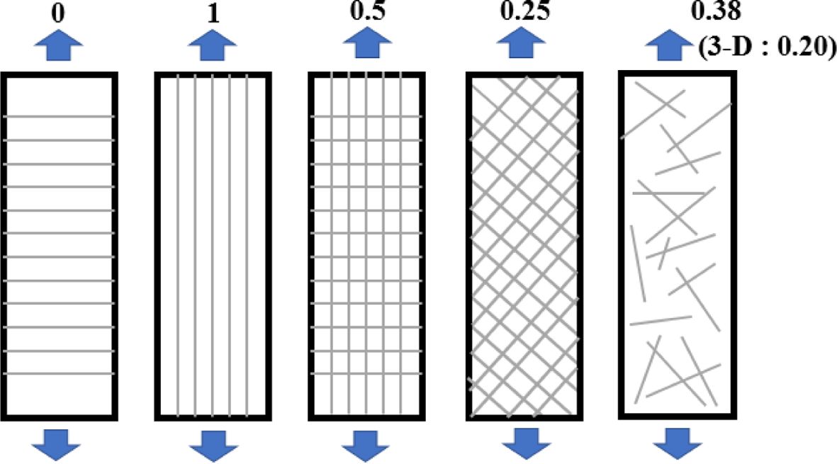 체적이며, Em, Vm은 기지재의 탄성강성과 체적이다. Fig. 2은 대표적으로 보여지고 있는 소재의 형태 및 방향 별 Krenshel’s Factor를 나타내고