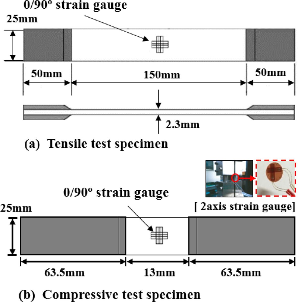 속도로 인장 및 압축 시험을 수행하였다. Fig. 3은 인장 및 압축시험편의 세부 치수 정보를 나타내고 있다.