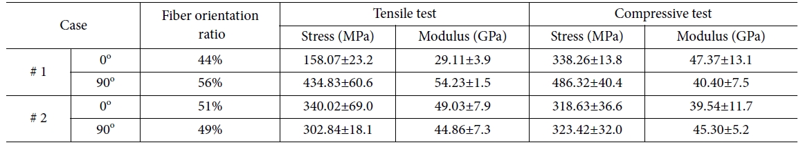 인장 및 압축시험을 통해 획득한 각 재료의 방향 별 강도 및 강성 값을 Table 2에 정리하였다. 조건 1의 경우 90o 방향 섬유 배향 비율이 56%로 0o 44%보다 높은 섬유 배향 비율을 보였으며, 이로 인해 90o 방향에서 높은 인장강성 값을 나타냈다. 조건 2의 경우 조건 1과