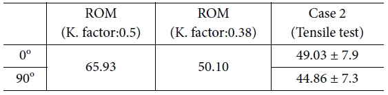 방향의 경우 인장 강성 실험치와 약 2.2%의 오차범위를 갖으며 90o 방향의 경우 약 11.7%의 오차범위를