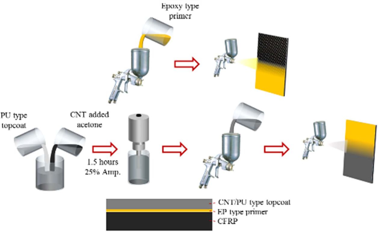 Fig. 1은 탄소나노튜브/폴리우레탄 탑코트의 분사공정 모식도이다. 오이항공에서 제공받은 탄소섬유강화복합재료 위에 에폭시 타입 프라이머를