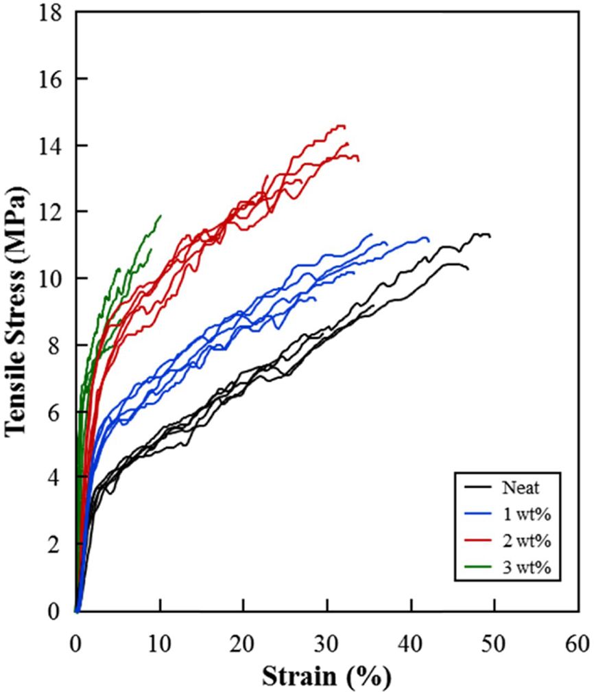 Fig. 3 Tensile test of CNT/PU films with different CNT weight fractions |