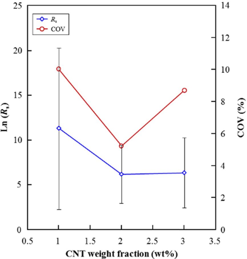 탑코트 내에 연결이 더 많이 발생하였기 때문이다. 하지만 공분산은 탄소나노튜브의 함량이 2 wt% 이후로 증가되는 것을 확인하였고, 이를 통하여